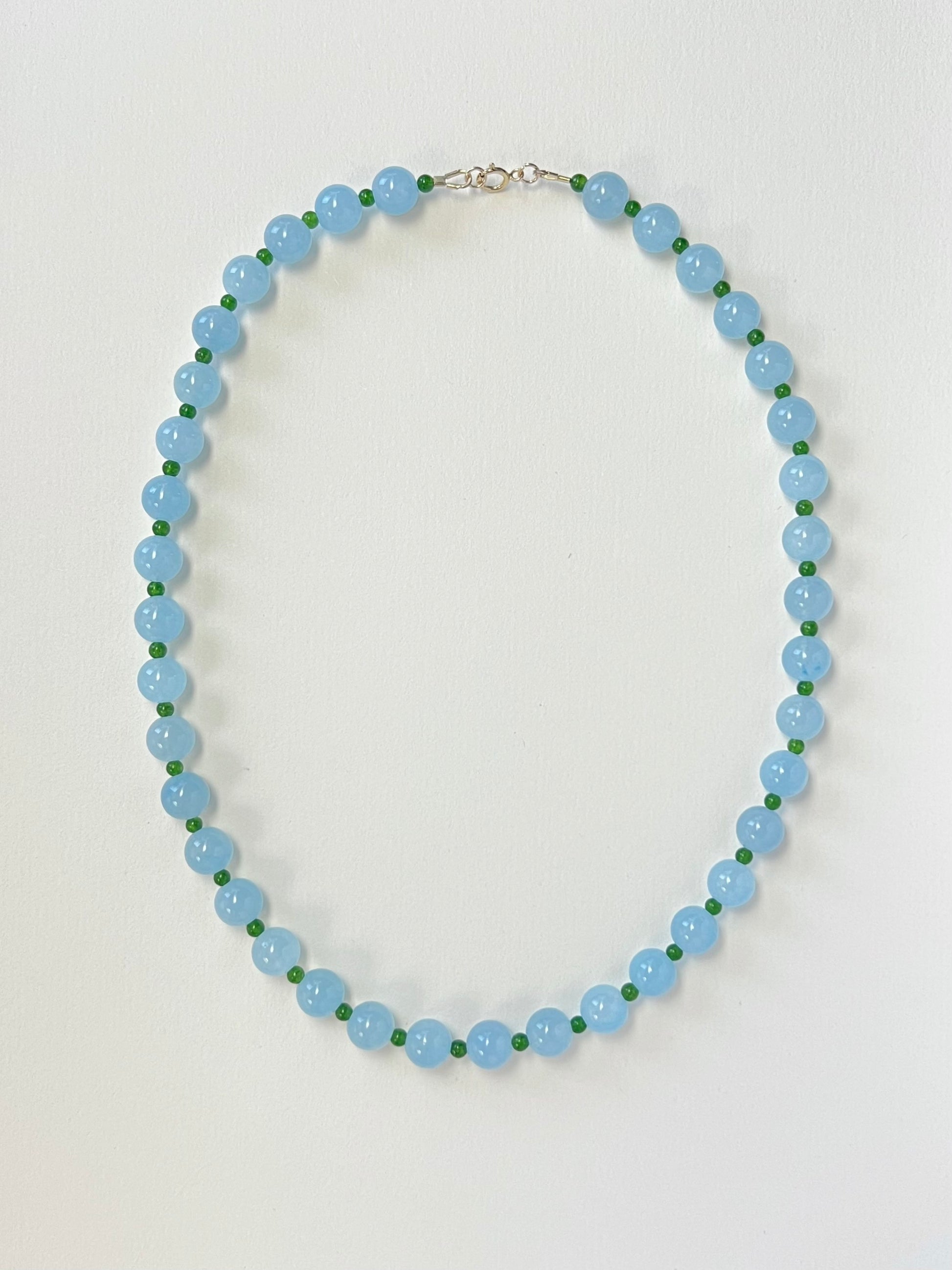 Made with smooth light-blue gemstones and small fresh green spacer gemstones .