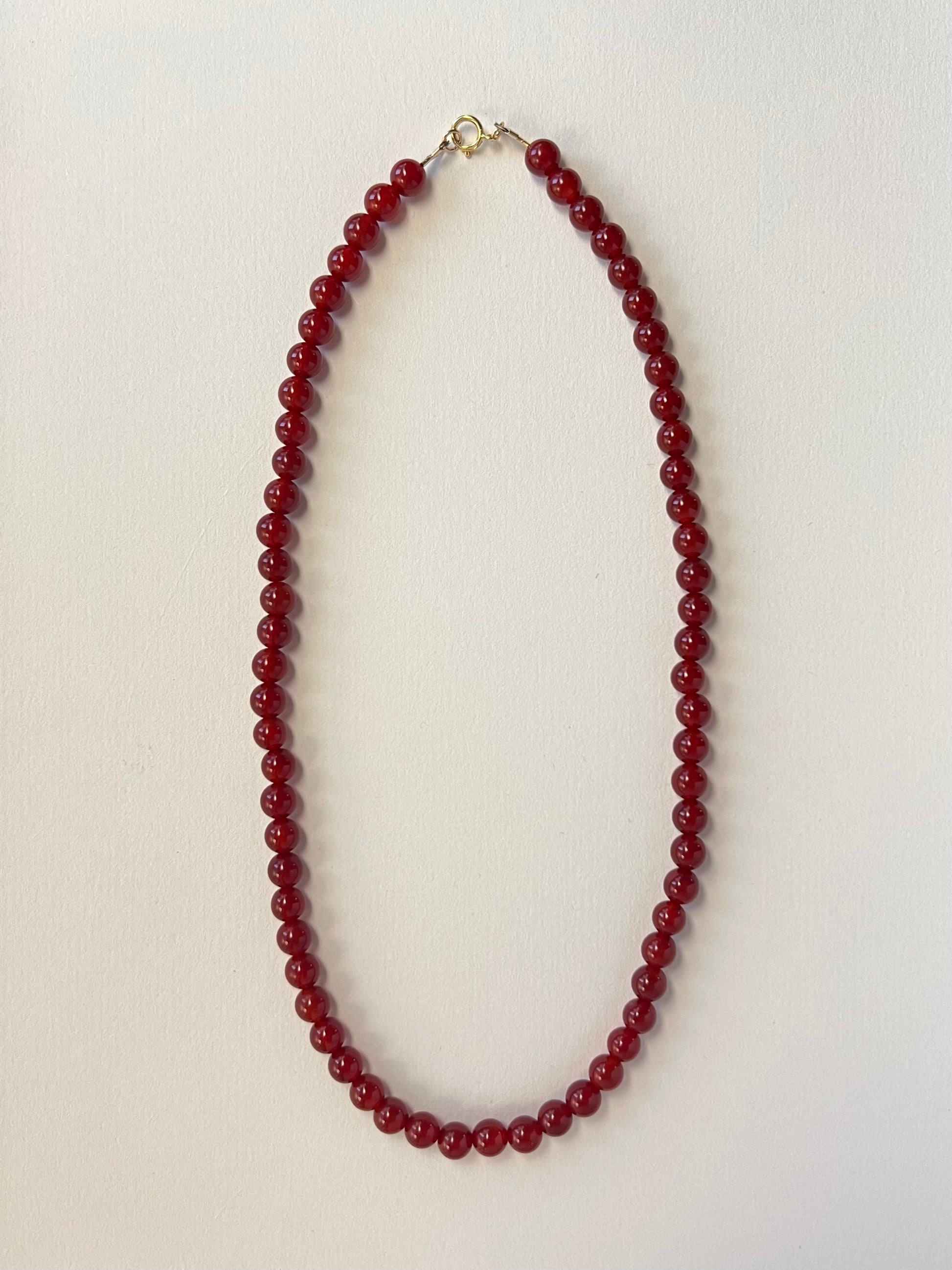Crafted with deep red agate beads that show a natural translucence, creating a simple and timeless strand.